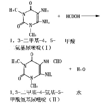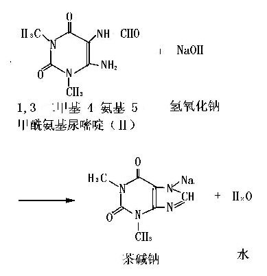 以甲酸將(I)甲?;?II),后者在堿性條件下脫去一分子水,閉環(huán)形成茶堿鈉。
